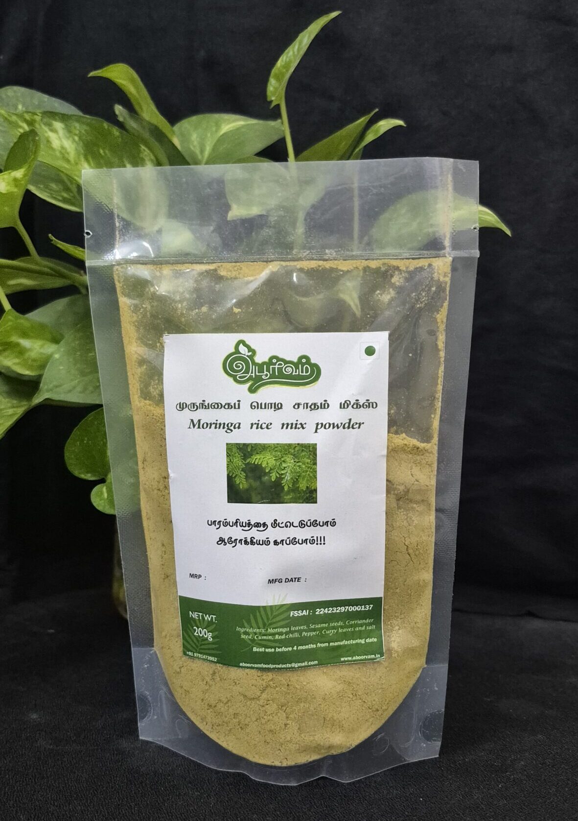 Experience the vibrant flavors and time-honored wisdom of South Indian tradition with Aboorvam’s Muringa Leaves Rice Mix Powder. This aromatic blend is crafted from handpicked muringa leaves, coriander seeds, cumin, red chilies, black pepper, and salt—roasted and ground to perfection. Ideal for mixing with hot rice and ghee or oil, this instant spice mix transforms a humble meal into a wholesome, flavorful delight. With its rich aroma and earthy taste, it offers a convenient way to enjoy the health benefits of curry leaves in everyday cooking.
